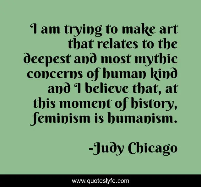 This page presents the quote "I am trying to make art that relates to the deepest and most mythic concerns of human kind and I believe that, at this moment of history, feminism is humanism.". Author of this quote is Judy Chicago. This quote is about believe, art,.