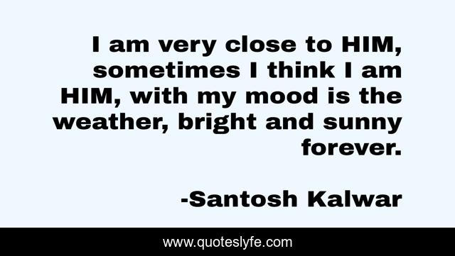 This page presents the quote "I am very close to HIM, sometimes I think I am HIM, with my mood is the weather, bright and sunny forever.". Author of this quote is Santosh Kalwar. This quote is about life, god, religion, inspirational, poems, enthusiasm,.