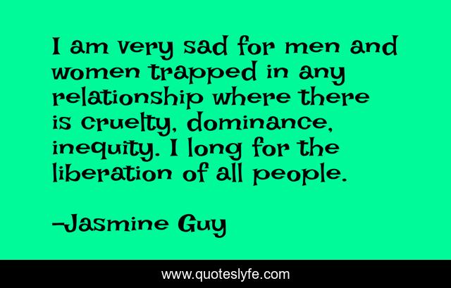 This page presents the quote "I am very sad for men and women trapped in any relationship where there is cruelty, dominance, inequity. I long for the liberation of all people.". Author of this quote is Jasmine Guy. This quote is about relationship, women,.