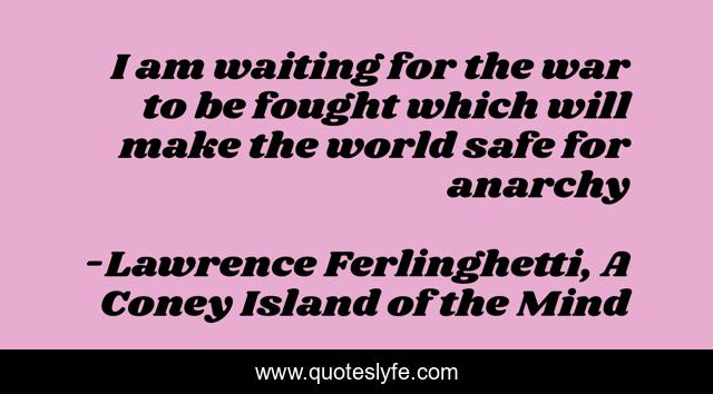 This page presents the quote "I am waiting for the war to be fought which will make the world safe for anarchy". Author of this quote is Lawrence Ferlinghetti, A Coney Island of the Mind. This quote is about irony, poetry,.