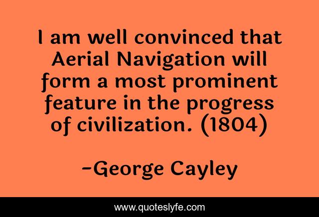 This page presents the quote "I am well convinced that Aerial Navigation will form a most prominent feature in the progress of civilization. (1804)". Author of this quote is George Cayley. This quote is about aerial-navigation, flight, prediction, civilization, progress, human-flight,.