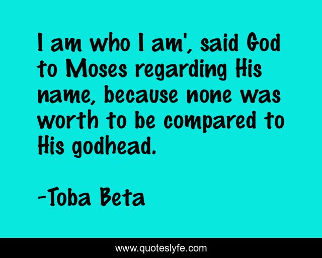 This page presents the quote "I am who I am', said God to Moses regarding His name, because none was worth to be compared to His godhead.". Author of this quote is Toba Beta. This quote is about god, moses, oneness, godhead,.