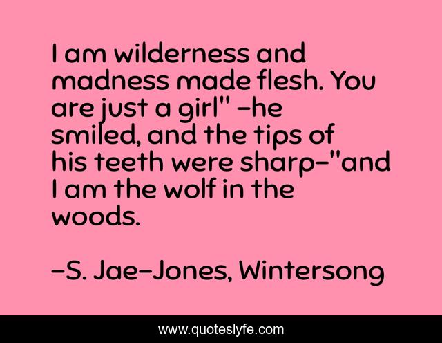 This page presents the quote "I am wilderness and madness made flesh. You are just a girl" –he smiled, and the tips of his teeth were sharp–"and I am the wolf in the woods.". Author of this quote is S. Jae-Jones, Wintersong. This quote is about romance, fantasy, 2017, ya, wintersong,.