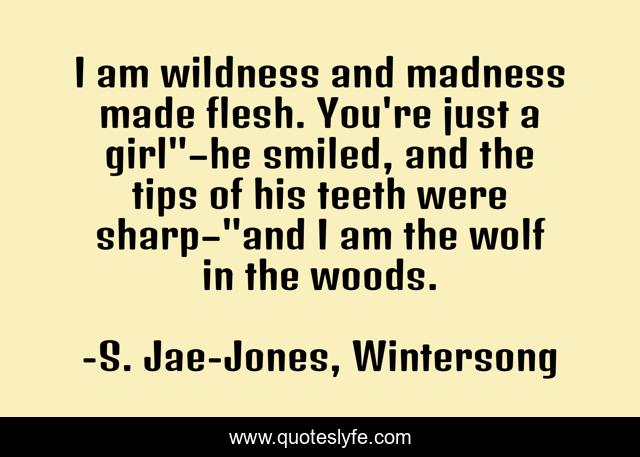 This page presents the quote "I am wildness and madness made flesh. You're just a girl"–he smiled, and the tips of his teeth were sharp–"and I am the wolf in the woods.". Author of this quote is S. Jae-Jones, Wintersong. This quote is about ya, fantasy, 2017,.
