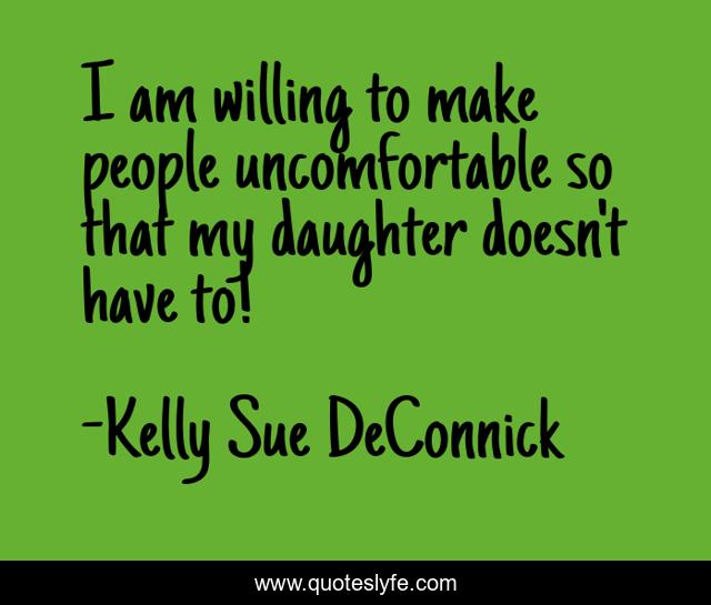 This page presents the quote "I am willing to make people uncomfortable so that my daughter doesn't have to!". Author of this quote is Kelly Sue DeConnick. This quote is about comics, feminism, writing,.