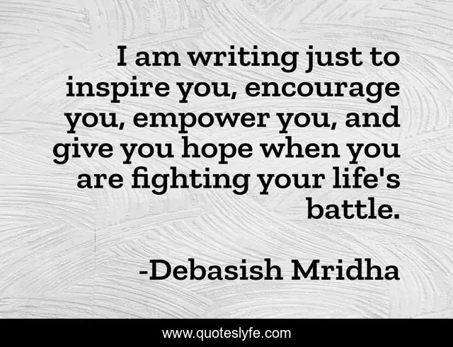 This page presents the quote "I am writing just to inspire you, encourage you, empower you, and give you hope when you are fighting your life's battle.". Author of this quote is Debasish Mridha. This quote is about life, debasish, mridha, empower, philosophy, writing, encourage, battle, hope,.