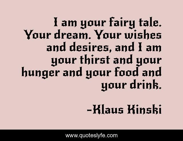 This page presents the quote "I am your fairy tale. Your dream. Your wishes and desires, and I am your thirst and your hunger and your food and your drink.". Author of this quote is Klaus Kinski. This quote is about wishes, dream,.