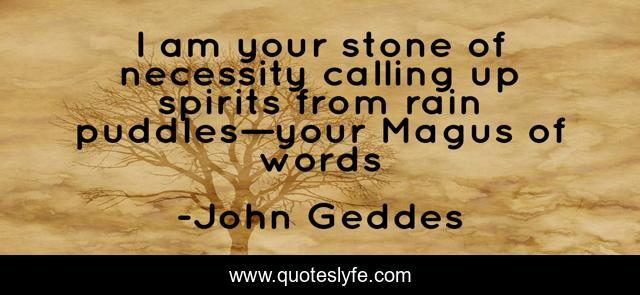 This page presents the quote "I am your stone of necessity calling up spirits from rain puddles—your Magus of words". Author of this quote is John Geddes. This quote is about creaivity, magic, free-spirit,.