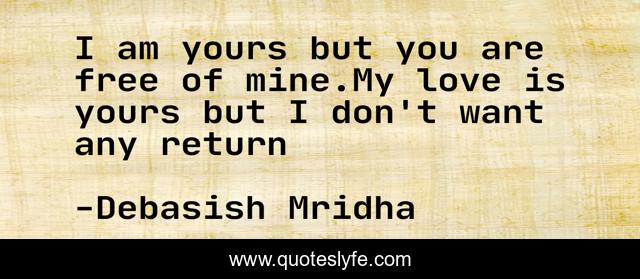 This page presents the quote "I am yours but you are free of mine.My love is yours but I don't want any return". Author of this quote is Debasish Mridha. This quote is about life, love, knowledge, inspirational, intelligence, philosophy, wisdom, quotes, affection,.