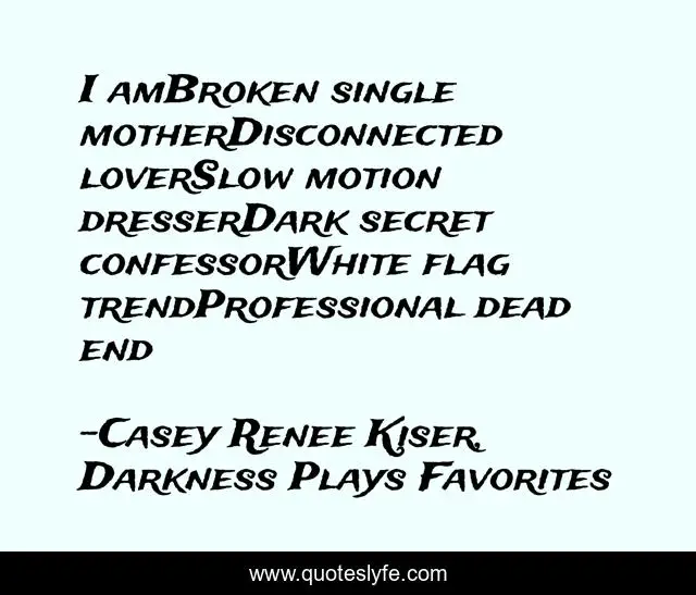 "Casey Renee Kiser, Darkness Plays Favorites Quotes." Quoteslyfe.com, 2025. Mon. 08 Dec. 2025. <https://www.quoteslyfe.com/quote/I-amBroken-single-motherDisconnected-loverSlow-motion-dresserDark-76040>.