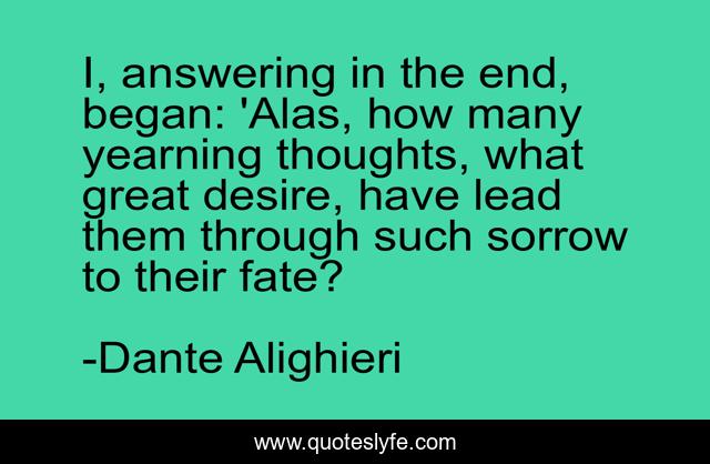 This page presents the quote "I, answering in the end, began: 'Alas, how many yearning thoughts, what great desire, have lead them through such sorrow to their fate?". Author of this quote is Dante Alighieri. This quote is about desire, sorrow, love, fate, affection,.