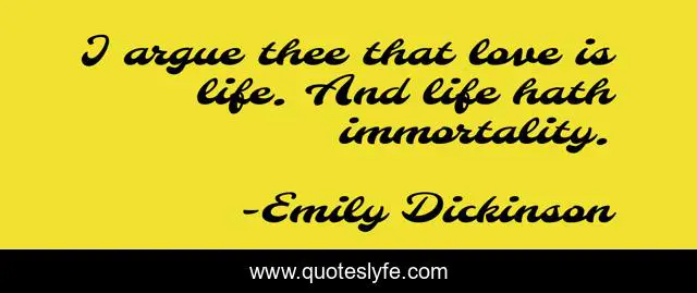 This page presents the quote "I argue thee that love is life. And life hath immortality.". Author of this quote is Emily Dickinson. This quote is about immortality, love, affection, love is,.