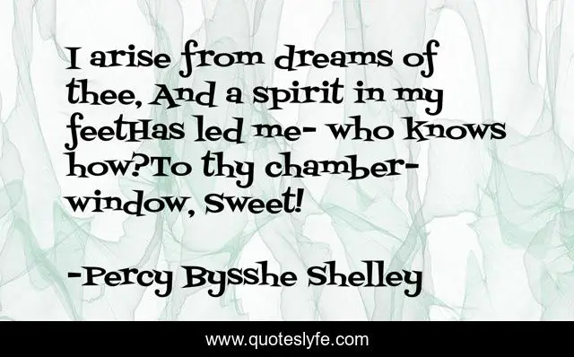 This page presents the quote "I arise from dreams of thee, And a spirit in my feetHas led me- who knows how?To thy chamber-window, Sweet!". Author of this quote is Percy Bysshe Shelley. This quote is about dreams, love, poetry, affection,.