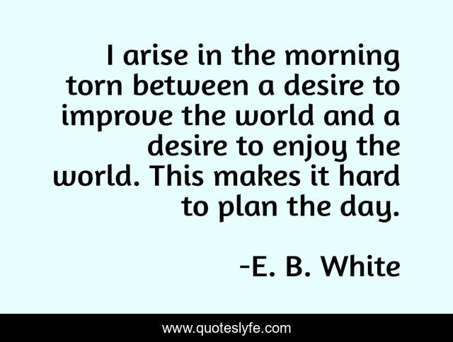 This page presents the quote "I arise in the morning torn between a desire to improve the world and a desire to enjoy the world. This makes it hard to plan the day.". Author of this quote is E. B. White. This quote is about world, life, day,.