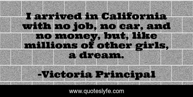 This page presents the quote "I arrived in California with no job, no car, and no money, but, like millions of other girls, a dream.". Author of this quote is Victoria Principal. This quote is about money, job, dream,.