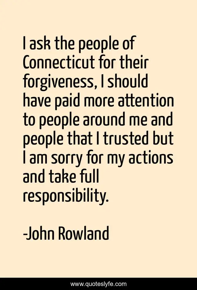 This page presents the quote "I ask the people of Connecticut for their forgiveness, I should have paid more attention to people around me and people that I trusted but I am sorry for my actions and take full responsibility.". Author of this quote is John Rowland. This quote is about sorry, responsibility,.