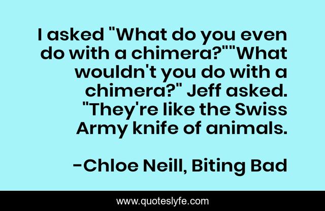 This page presents the quote "I asked "What do you even do with a chimera?""What wouldn't you do with a chimera?" Jeff asked. "They're like the Swiss Army knife of animals.". Author of this quote is Chloe Neill, Biting Bad. This quote is about animals, mythology, humor,.