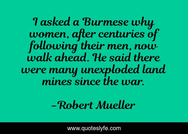 This page presents the quote "I asked a Burmese why women, after centuries of following their men, now walk ahead. He said there were many unexploded land mines since the war.". Author of this quote is Robert Mueller. This quote is about women, men, walk,.