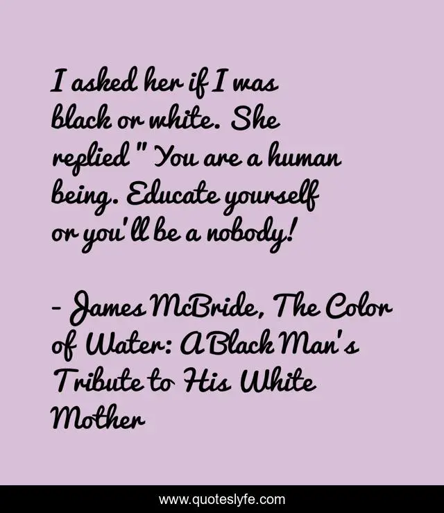 This page presents the quote "I asked her if I was black or white. She replied "You are a human being. Educate yourself or you'll be a nobody!". Author of this quote is James McBride, The Color of Water: A Black Man's Tribute to His White Mother. This quote is about enthusiasm, inspirational,.