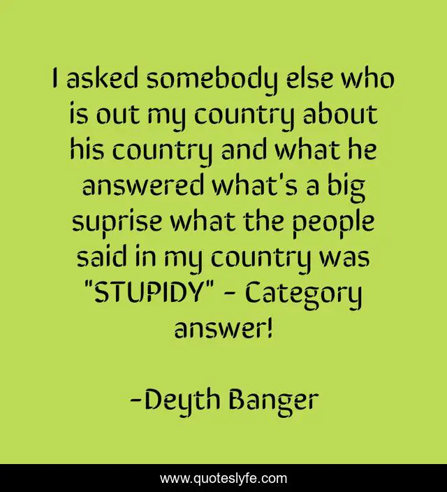 This page presents the quote "I asked somebody else who is out my country about his country and what he answered what's a big suprise what the people said in my country was "STUPIDY" - Category answer!". Author of this quote is Deyth Banger. This quote is about stupid, clever, wise,.