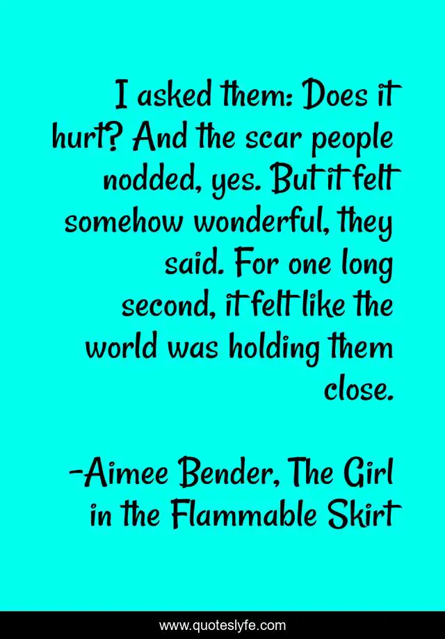 This page presents the quote "I asked them: Does it hurt? And the scar people nodded, yes. But it felt somehow wonderful, they said. For one long second, it felt like the world was holding them close.". Author of this quote is Aimee Bender, The Girl in the Flammable Skirt. This quote is about life, pain, beauty,.