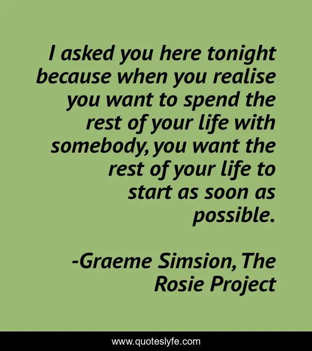 This page presents the quote "I asked you here tonight because when you realise you want to spend the rest of your life with somebody, you want the rest of your life to start as soon as possible.". Author of this quote is Graeme Simsion, The Rosie Project. This quote is about cute, love, truth, affection,.
