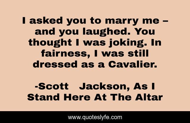 This page presents the quote "I asked you to marry me – and you laughed. You thought I was joking. In fairness, I was still dressed as a Cavalier.". Author of this quote is Scott Jackson, As I Stand Here At The Altar. This quote is about humor, love-story,.