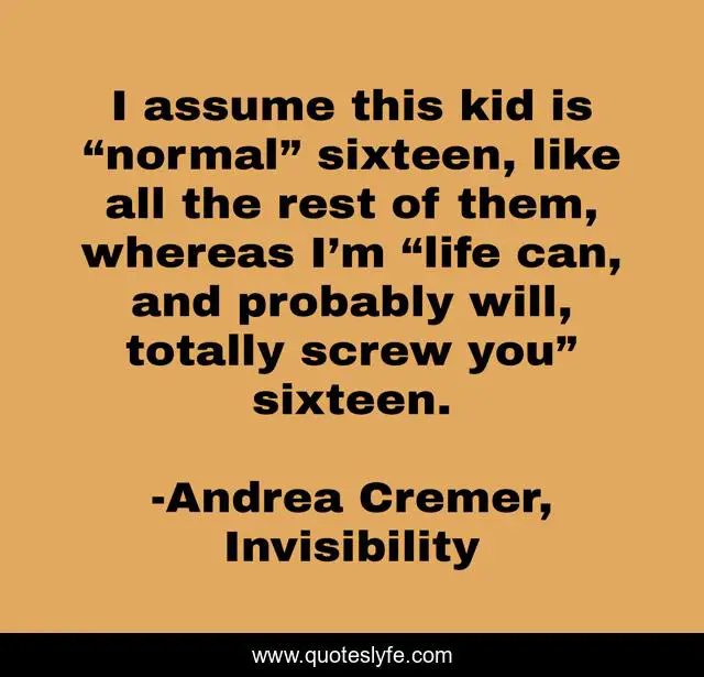 "Andrea Cremer, Invisibility Quotes." Quoteslyfe.com, 2025. Sat. 06 Dec. 2025. <https://www.quoteslyfe.com/quote/I-assume-this-kid-is-normal-sixteen-246473>.