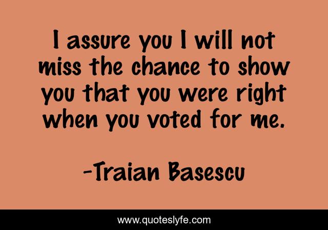 This page presents the quote "I assure you I will not miss the chance to show you that you were right when you voted for me.". Author of this quote is Traian Basescu. This quote is about me, right,.