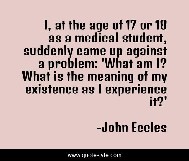This page presents the quote "I, at the age of 17 or 18 as a medical student, suddenly came up against a problem: 'What am I? What is the meaning of my existence as I experience it?'". Author of this quote is John Eccles. This quote is about age, problem, experience,.