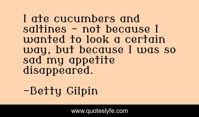 This page presents the quote "I ate cucumbers and saltines - not because I wanted to look a certain way, but because I was so sad my appetite disappeared.". Author of this quote is Betty Gilpin. This quote is about because, look, way,.