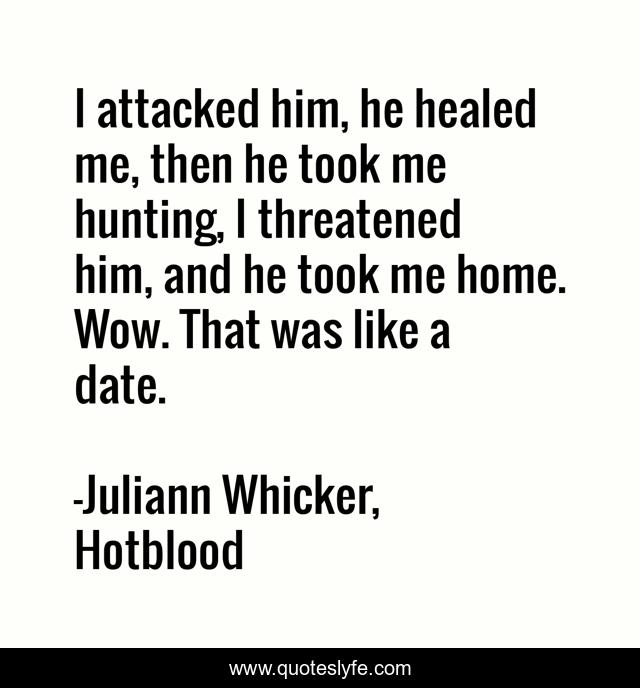 This page presents the quote "I attacked him, he healed me, then he took me hunting, I threatened him, and he took me home. Wow. That was like a date.". Author of this quote is Juliann Whicker, Hotblood. This quote is about funny, dating, comedy, lol,.