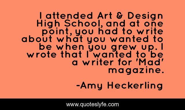 This page presents the quote "I attended Art & Design High School, and at one point, you had to write about what you wanted to be when you grew up. I wrote that I wanted to be a writer for 'Mad' magazine.". Author of this quote is Amy Heckerling. This quote is about school, high school, art,.