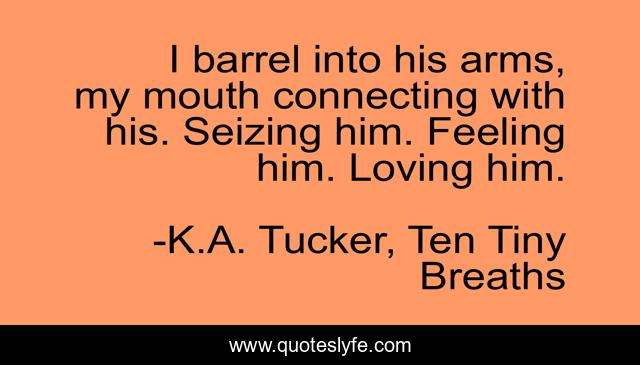 This page presents the quote "I barrel into his arms, my mouth connecting with his. Seizing him. Feeling him. Loving him.". Author of this quote is K.A. Tucker, Ten Tiny Breaths. This quote is about love, trent-kacey, sweet, kacey-cleary, trent-emerson, ten-tiny-breaths, k-a-tucker, affection,.