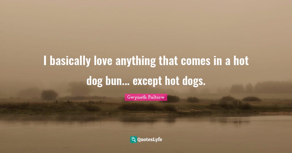 This page presents the quote "I basically love anything that comes in a hot dog bun... except hot dogs.". Author of this quote is Gwyneth Paltrow. This quote is about buns, affection, dog, love, hot,.