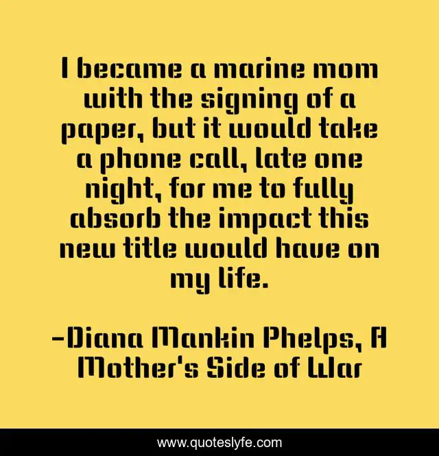 This page presents the quote "I became a marine mom with the signing of a paper, but it would take a phone call, late one night, for me to fully absorb the impact this new title would have on my life.". Author of this quote is Diana Mankin Phelps, A Mother's Side of War. This quote is about aaron-mankin, mothers, warriors, sons, military, wounded-warriors, war,.