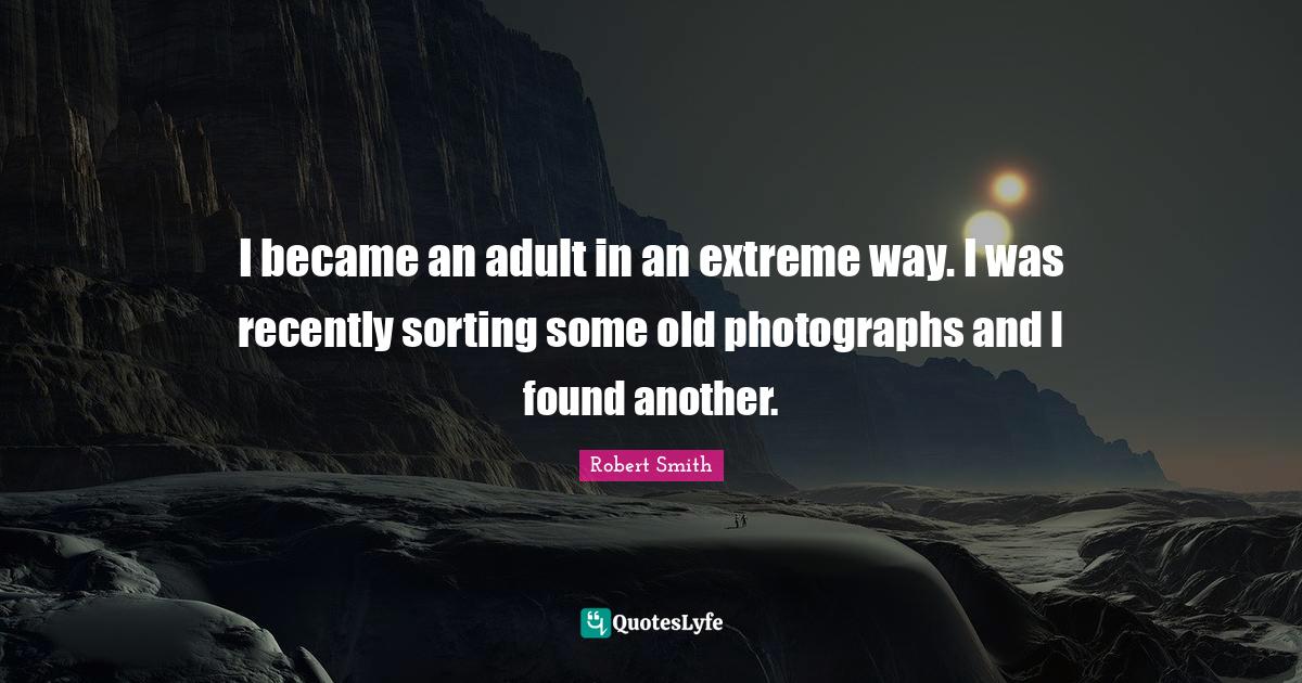 This page presents the quote "I became an adult in an extreme way. I was recently sorting some old photographs and I found another.". Author of this quote is Robert Smith. This quote is about way, adults, sorting, found, photograph, old photographs,.