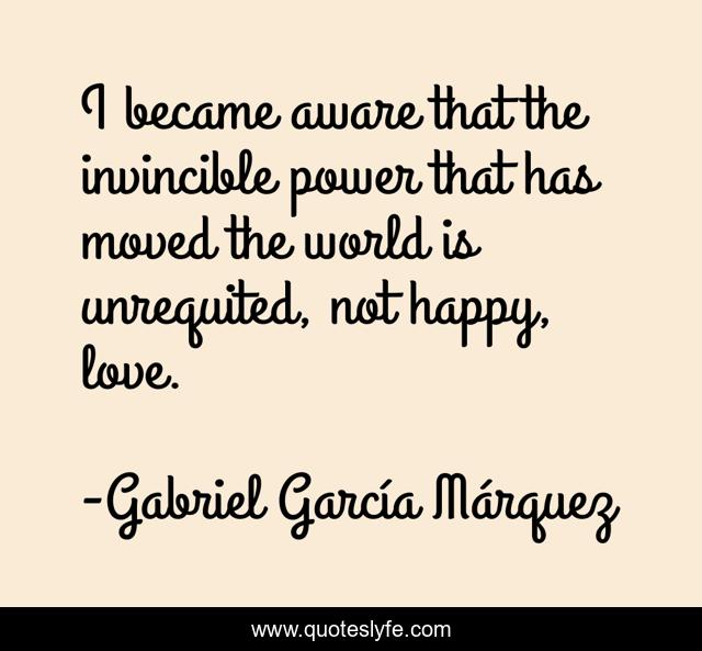 This page presents the quote "I became aware that the invincible power that has moved the world is unrequited, not happy, love.". Author of this quote is Gabriel García Márquez. This quote is about love, truth, affection,.