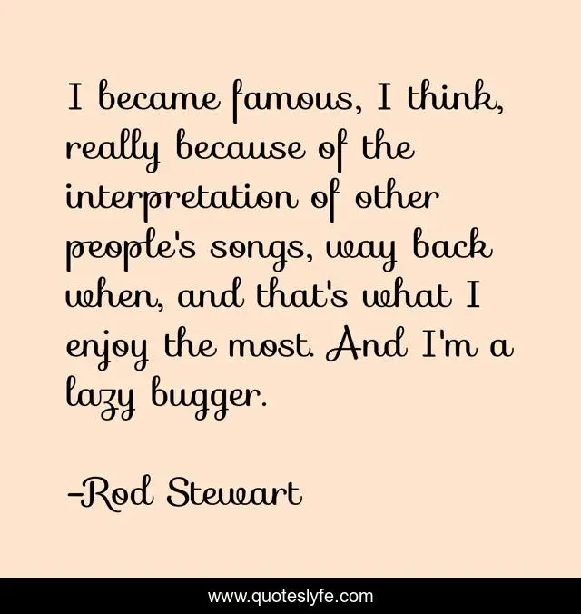 This page presents the quote "I became famous, I think, really because of the interpretation of other people's songs, way back when, and that's what I enjoy the most. And I'm a lazy bugger.". Author of this quote is Rod Stewart. This quote is about enjoy, think, people,.