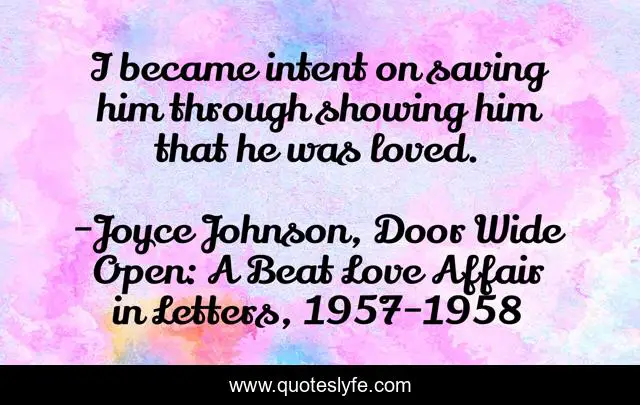 This page presents the quote "I became intent on saving him through showing him that he was loved.". Author of this quote is Joyce Johnson, Door Wide Open: A Beat Love Affair in Letters, 1957-1958. This quote is about rescue-mentality, love, sacrifice, hopeless, kerouac, affection,.