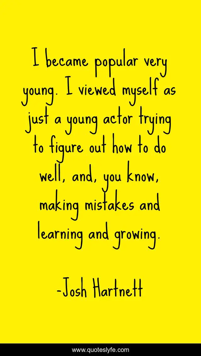 This page presents the quote "I became popular very young. I viewed myself as just a young actor trying to figure out how to do well, and, you know, making mistakes and learning and growing.". Author of this quote is Josh Hartnett. This quote is about myself, mistakes,.