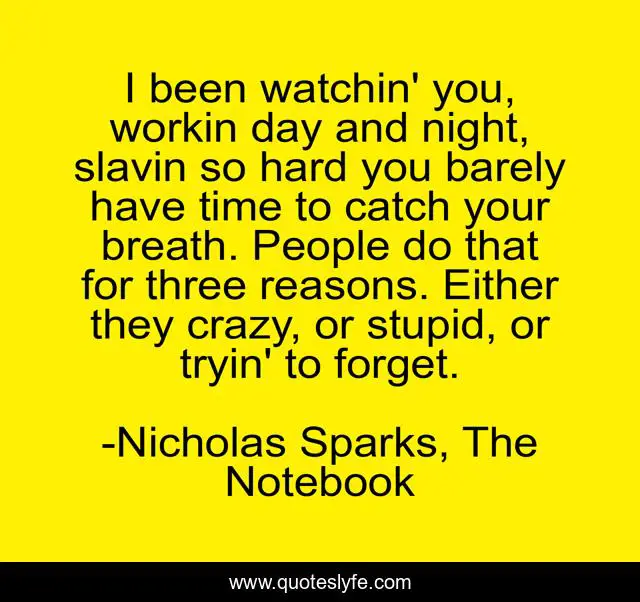 This page presents the quote "I been watchin' you, workin day and night, slavin so hard you barely have time to catch your breath. People do that for three reasons. Either they crazy, or stupid, or tryin' to forget.". Author of this quote is Nicholas Sparks, The Notebook. .
