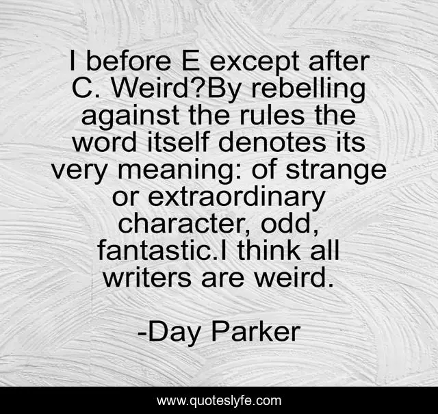 This page presents the quote "I before E except after C. Weird?By rebelling against the rules the word itself denotes its very meaning: of strange or extraordinary character, odd, fantastic.I think all writers are weird.". Author of this quote is Day Parker. This quote is about writers-life, writing-life, writing, writers, writers-on-writing, writers-world,.