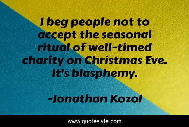 This page presents the quote "I beg people not to accept the seasonal ritual of well-timed charity on Christmas Eve. It's blasphemy.". Author of this quote is Jonathan Kozol. This quote is about charity, accept, people,.