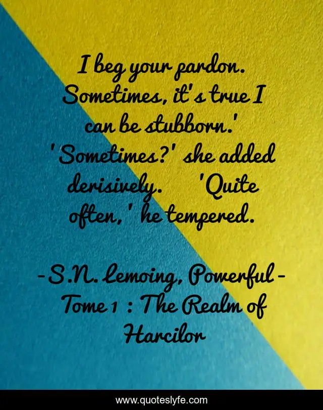 This page presents the quote "I beg your pardon. Sometimes, it's true I can be stubborn.' 'Sometimes?' she added derisively. 'Quite often, ' he tempered.". Author of this quote is S.N. Lemoing, Powerful - Tome 1 : The Realm of Harcilor. This quote is about medieval, french-author, romance, fantasy, self-published, indie-author,.