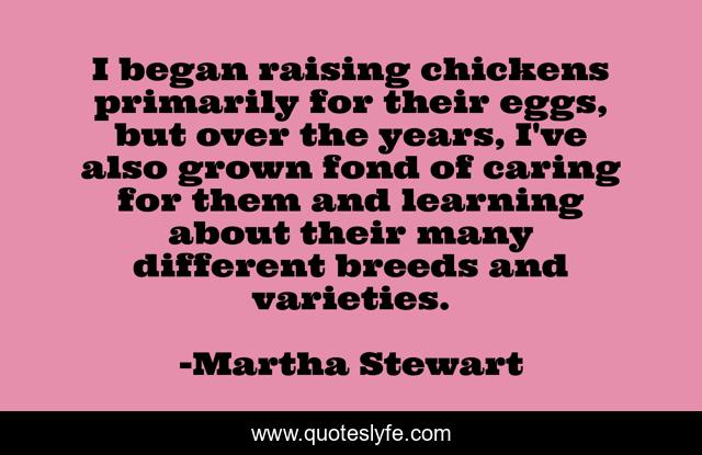 This page presents the quote "I began raising chickens primarily for their eggs, but over the years, I've also grown fond of caring for them and learning about their many different breeds and varieties.". Author of this quote is Martha Stewart. This quote is about caring, eggs, years,.