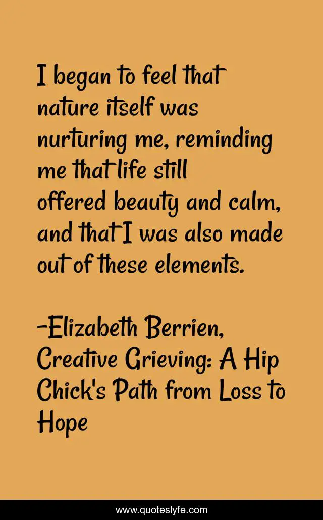 This page presents the quote "I began to feel that nature itself was nurturing me, reminding me that life still offered beauty and calm, and that I was also made out of these elements.". Author of this quote is Elizabeth Berrien, Creative Grieving: A Hip Chick's Path from Loss to Hope. This quote is about loss, support, bereavement, grief, inspirational, enthusiasm, hope,.