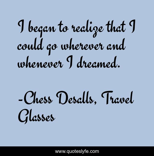 This page presents the quote "I began to realize that I could go wherever and whenever I dreamed.". Author of this quote is Chess Desalls, Travel Glasses. This quote is about fantasy, travel, science-fiction-young-adult,.