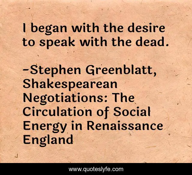 This page presents the quote "I began with the desire to speak with the dead.". Author of this quote is Stephen Greenblatt, Shakespearean Negotiations: The Circulation of Social Energy in Renaissance England. This quote is about desire, knowledge, shakespeare, historians, education, history,.