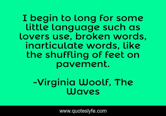 This page presents the quote "I begin to long for some little language such as lovers use, broken words, inarticulate words, like the shuffling of feet on pavement.". Author of this quote is Virginia Woolf, The Waves. This quote is about love, language, affection,.